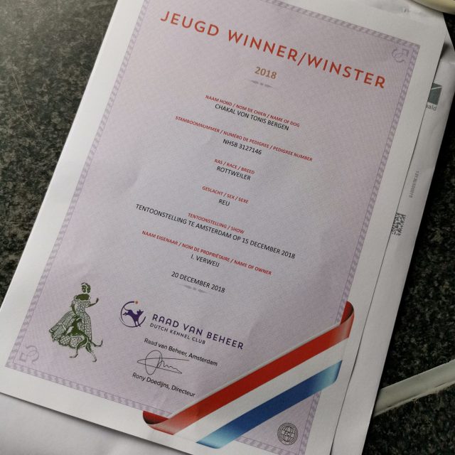 Op 14 april zijn we in alle vroegte afgereisd naar Antwerpen om deel te nemen aan de Brabo winner show 2019. Keurmeester : Dhr C. Habig (DE) Chakal von Tonis Bergen - Tussenklasse reuen 1 Uitmuntend, CAC, CACIB, Beste reu, Beste van het Ras, BOB en hiermee Brabowinner 2019 Hurricane…Lees verder
